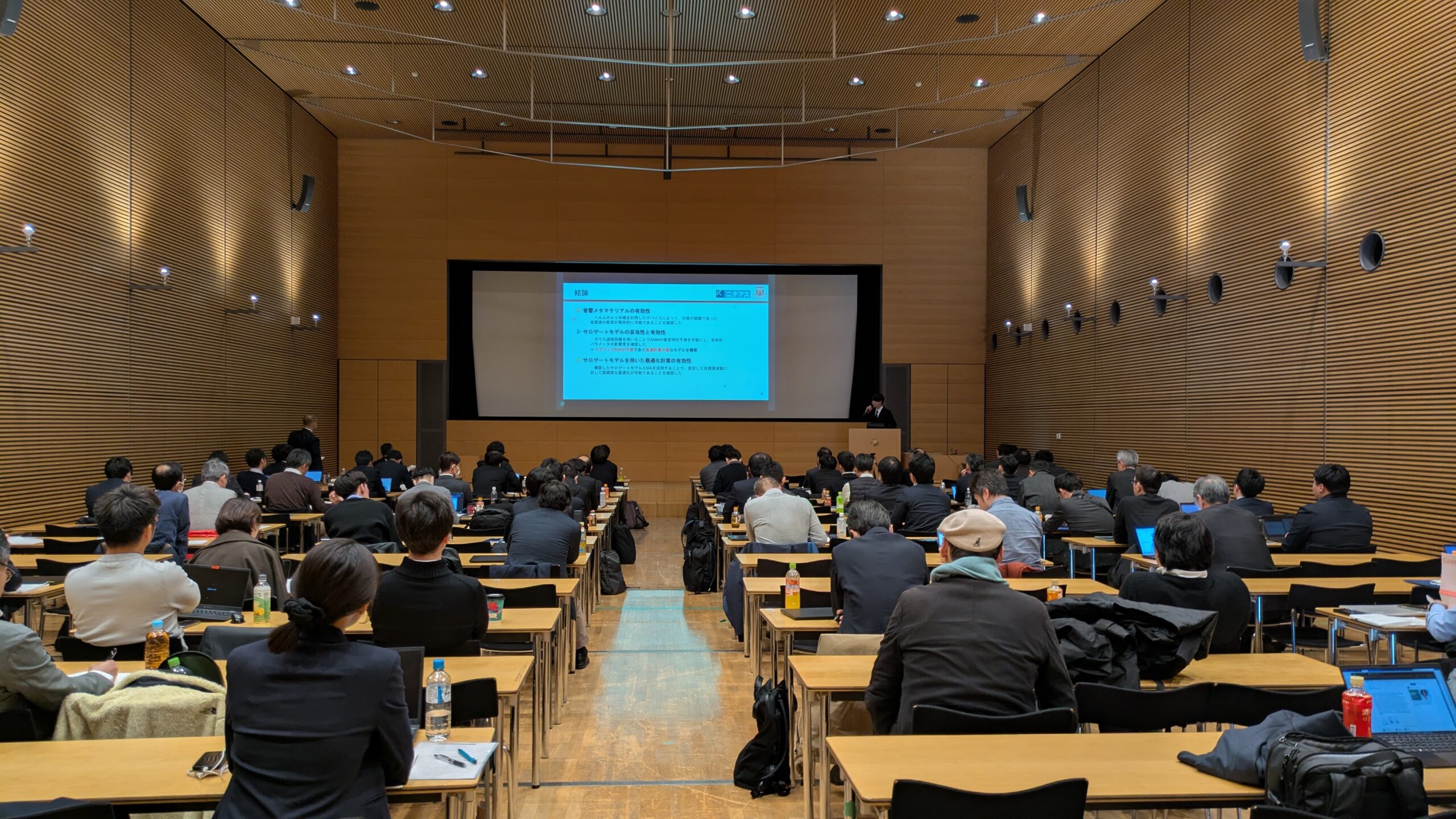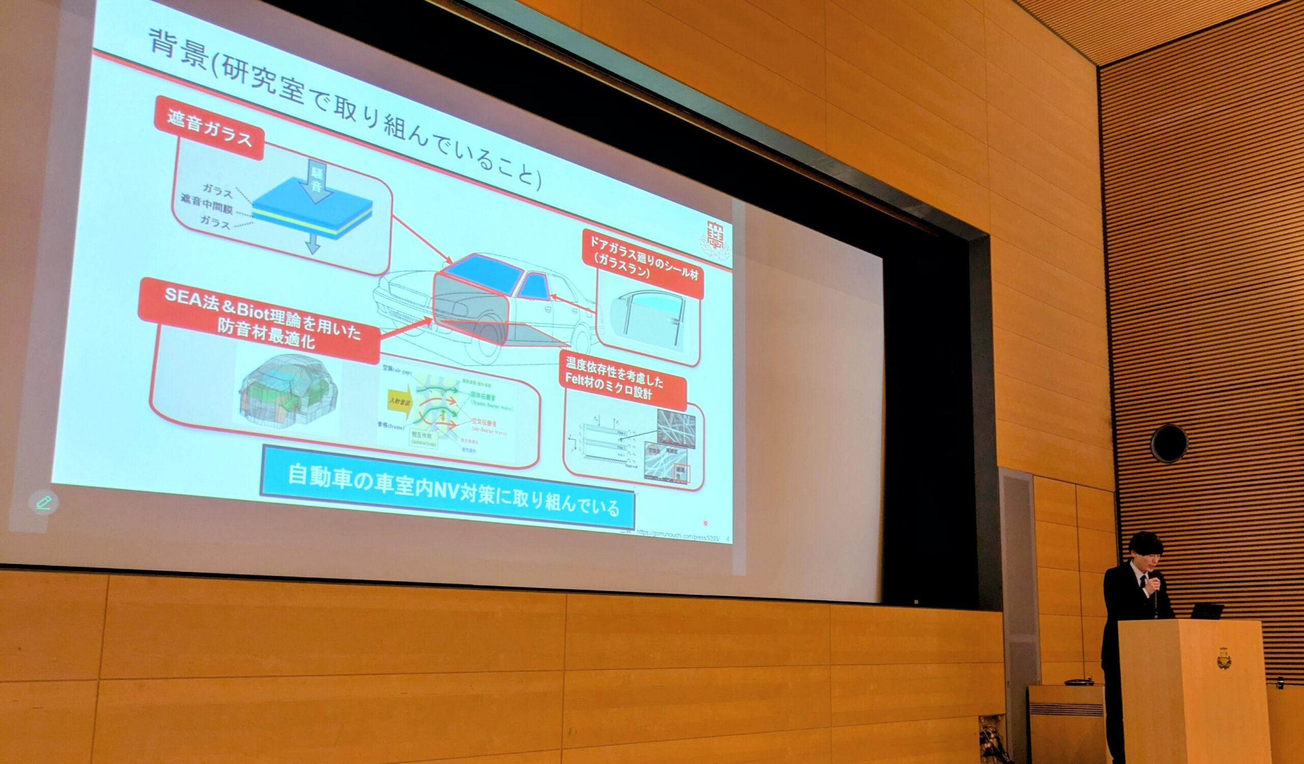 本シンポジウムは、主に企業の技術者を対象とした専門性の高い催しであり、当日は約160名が参加しました。山路君は「音響メタマテリアルに対する機械学習を用いたサロゲートモデルに関する研究」をテーマに発表し、産業界からの関心も高く、発表後には活発な質疑応答が行われました。