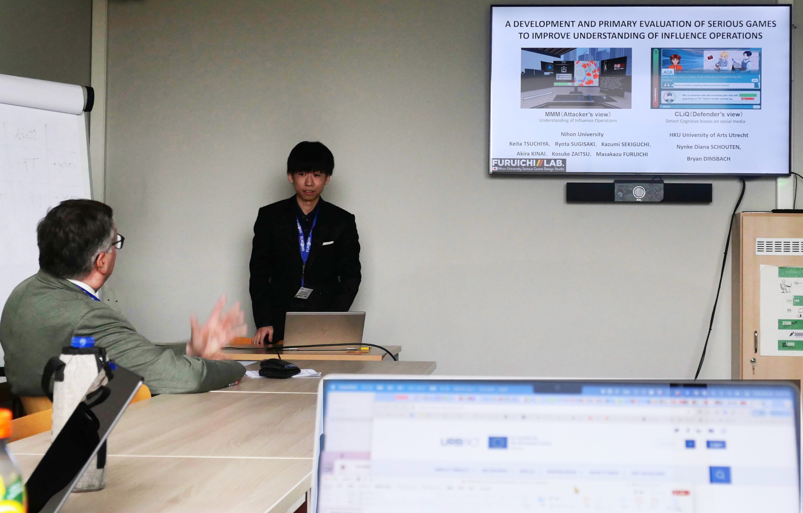 2025年10月22日〜24日にベルギーのゲント(Ghent)で開催された26TH INTERNATIONAL CONFERENCE ON INTELLIGENT GAMES AND SIMULATION(Game-ON 2025)で,4年生の土屋慶太君が「A Development and Primary Evaluation of Serious Games to Improve Understanding of Influence Operations (Keita Tsuchiya, Ryota Sugisaki, Kazumi Sekiguchi, Akira Kinai, Kosuke Zaitsu, Masakazu Furuichi, Nynke Diana Schouten, Bryan Dinsbach)」というタイトルで発表しました.本研究成果は,SNS等を介して行われる影響工作(Influence Operation)に対する理解を深めることを目的として開発したシリアスゲームMMMと,影響工作に対する対処能力を認知バイアスに対する即応検知能力向上により実現することを目的として開発したシリアスゲームCLiQに関するもので,両シリアスゲームの概要を説明した後,CLiQについて有効性の評価を行った結果を発表しました.