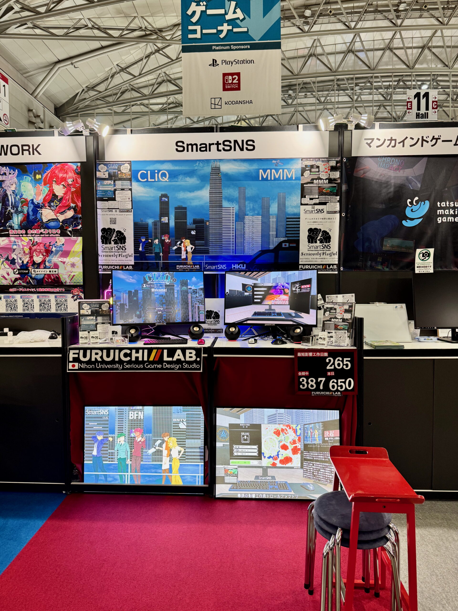 2025年9月25日(木)から28日(日)に幕張メッセで開催された東京ゲームショウ2025で展示された2本のシリアスゲーム(CLiQとMMM)を開発したのは,メディアデザインコースの4年生,オランダのユトレヒト芸術大学から半年間インターンシップに来た学生と大学院の博士後期課程の学生である.