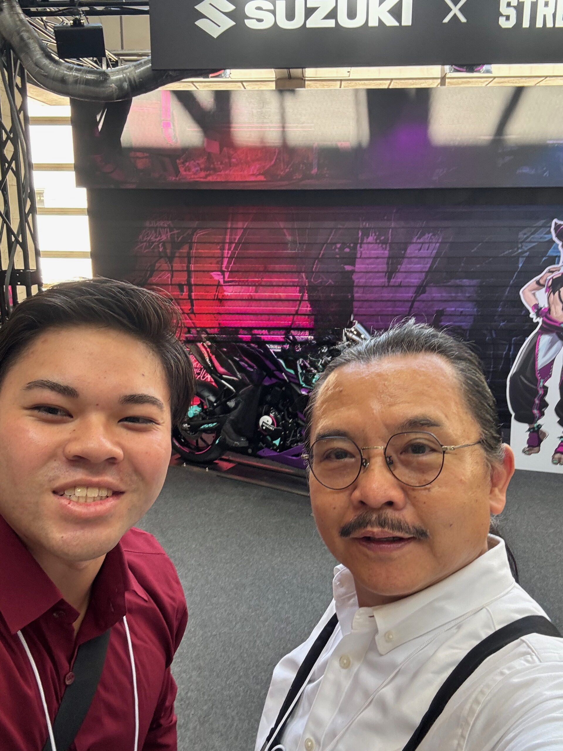 東京ゲームショウというとゲーム会社ばかりが出展していると思われがちだが,2輪・4輪自動車メーカのSUZUKIに就職した数理情報工学科新井研究室出身の学生も,ストリートファイターのキャラクタ・ジュリとのコラボバイクの展示をしていた.