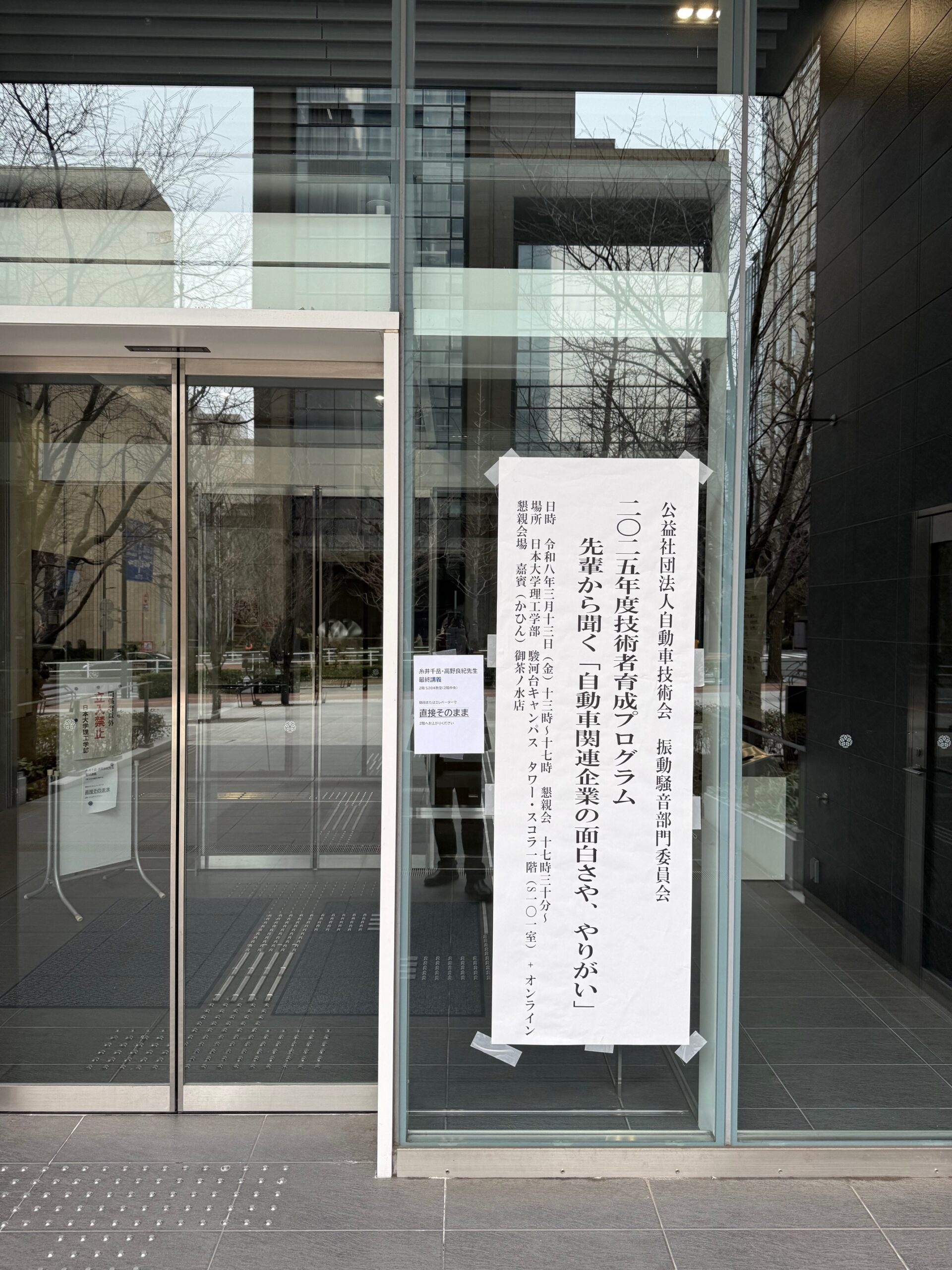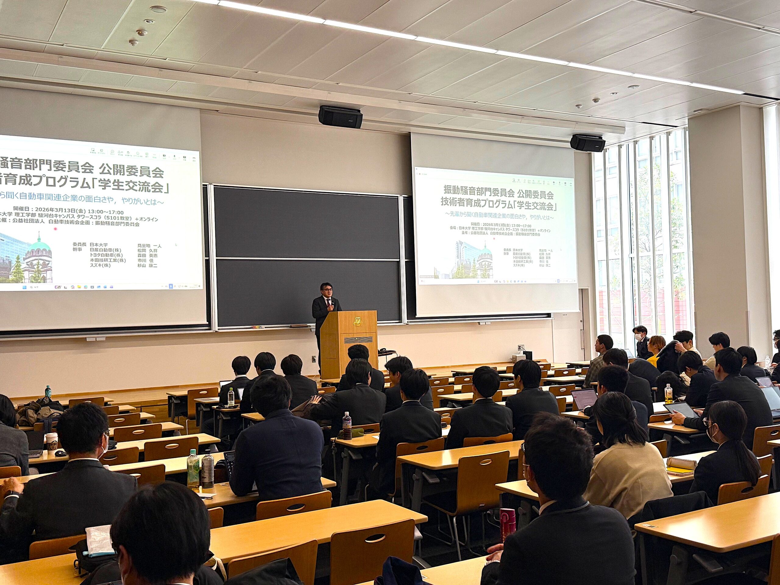 3月13日に、日本大学 理工学部駿河台キャンパスにおいて、数理情報工学科の見坐地先生が委員長を務める(公社)自動車技術会 振動騒音部門委員会 技術者育成プログラム(学生交流会)を理工学部の岡部先生の協力もいただき、実施しました。
